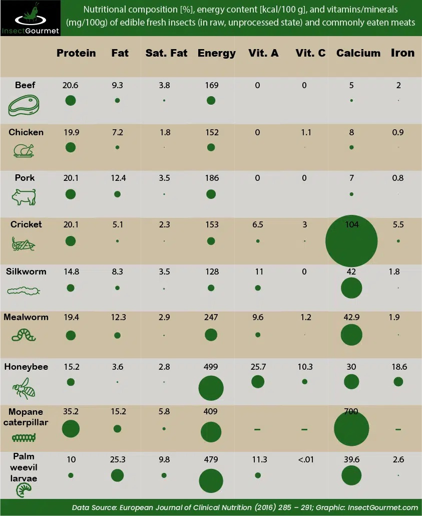 Nutritional comparison between bugs and beef have been made. This graphic outlines the differences and suggests why “sustainability”advocates are pushing the bugs. Source.