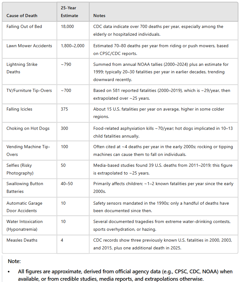 Falling from bed, being stabbed by falling icicles, being struck by lightning, being run over by a lawnmower, being crushed by a television, vending machine, or garage door, choking on a hot dog, being poisoned by batteries, having a selfie accident, etc. A person is much more likely to die from any of these than to die from measles.