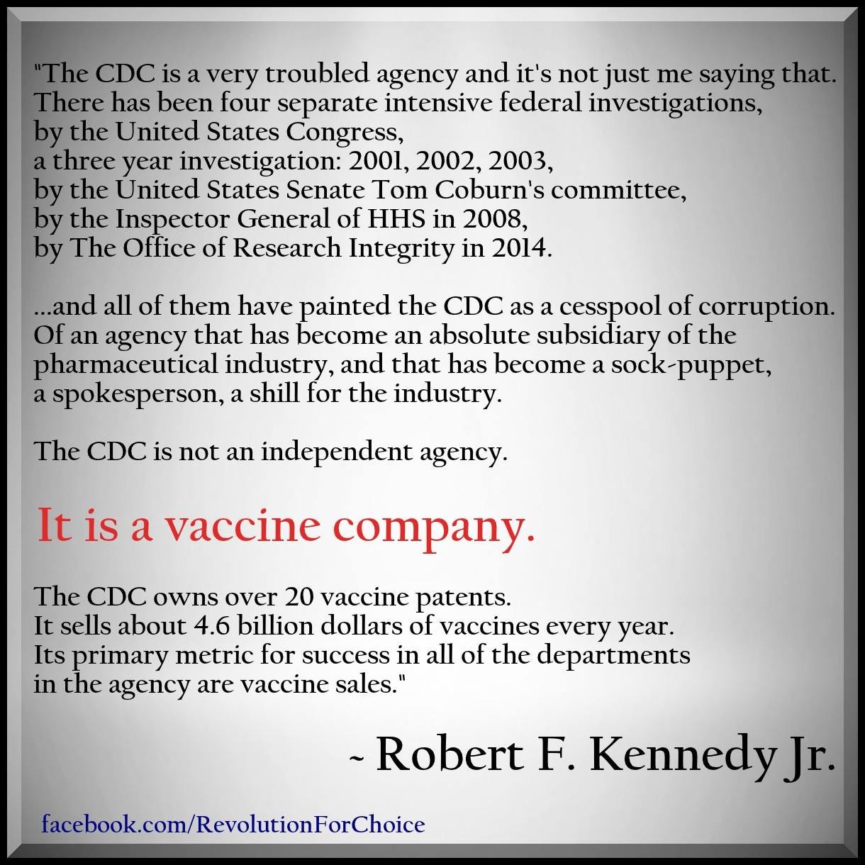 Bobby was right then and he’s right now. We need a complete overhaul of the cesspool of corruption known as the CDC. And he’s doing it.