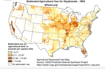 Yet, look how glyphosate usage has expanded over the years. These graphics are from the US Geological Survey’s Pesticide National Synthesis Project. They document the estimated annual agricultural pesticide use across the US over the last 30 years, from 1993 to 2023.