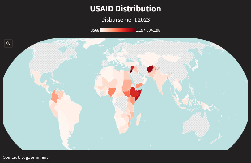 Fiscal year 2023 is the most recent year that data is available. During that year, USAID distributed $72 billion. The largest distribution of aid, $16 billion, went to….Ukraine. The second largest amount, $1.7 billion, went to Ethiopia as the Houthis continued to shell civilians.