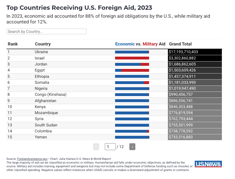 Democrats are running scared. They can run, but they can’t hide from this one. As Trump says, it is “too big, too dirty.” And it has been going on for a long, long time. This screenshot only contains the first 15 countries, but holy cow. $17B to Ukraine? $3B to Israel? $733M to Yemen? And this was for only one year: 2023. To see the full list of 176 countries we gave money to in that year and the amounts go here.